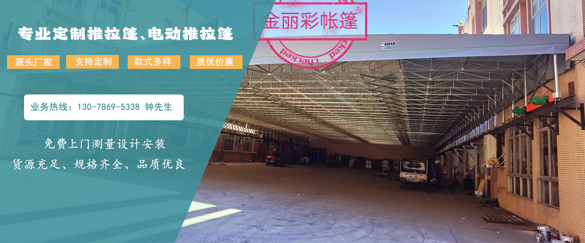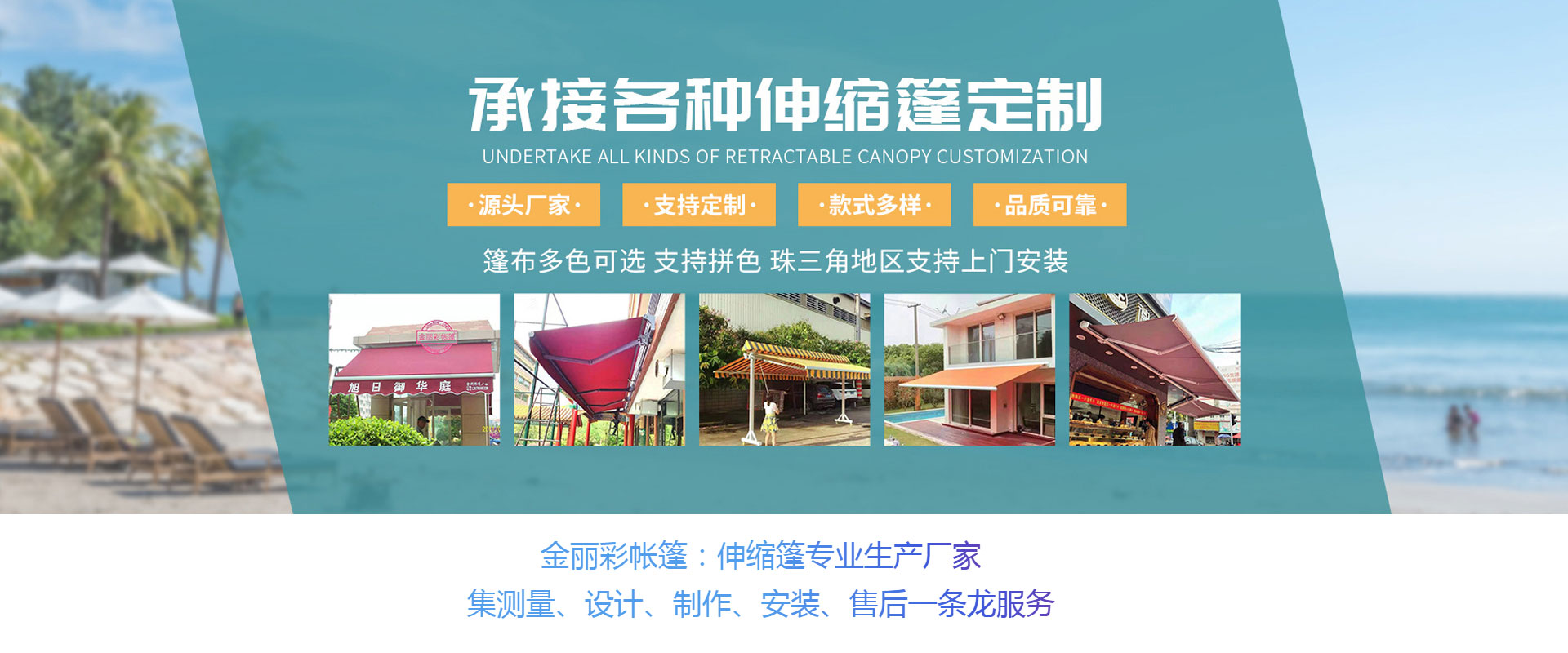 中山市金麗彩帳篷有限公司成立于2002年,是一家集遮陽篷配件生產(chǎn)、批發(fā)戶外休閑用品的專業(yè)彩蓬安裝制做工程公司,在廣東地區(qū)擁有大量彩樣板工程實例,公司技術力量成熟,專注承接定制制作安裝各種遮陽、遮雨、固定或活動蓬、展覽蓬、鋁合金無線遙控電動蓬、廣告蓬、歐式造型蓬、戶外休閑傘等產(chǎn)品。本公司還可以根據(jù)用戶需求制作各款大型戶外停車場帳蓬、款式新穎、質(zhì)量可靠、價格實惠。公司位于中國廣東省中山市沙溪鎮(zhèn),交通方便,物流快捷。金麗彩帳篷本著“客戶為先,誠信至上”的原則,熱誠歡迎各界朋友前來我司參觀、考察、洽談業(yè)務。